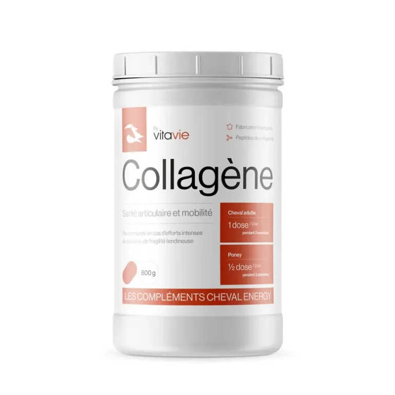 Le Collagène Cheval Energy répond aux besoins spécifiques des chevaux dont l’appareil locomoteur est fortement sollicité. Fruit de la collaboration entre Cheval Energy et le laboratoire Vitavie, ce complément alimentaire bénéficie d’un savoir-faire unique développé en nutrition humaine depuis plus de 20 ans, aujourd’hui mis au service du bien-être animal.