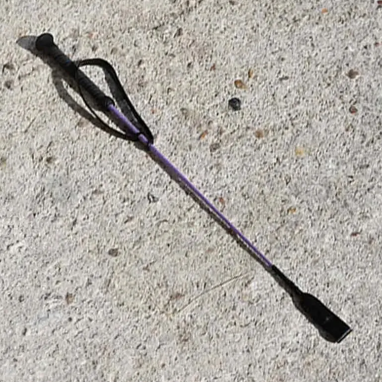Cravache en fibre de verre gainée de nylon, claquette et dragonne en cuir.
