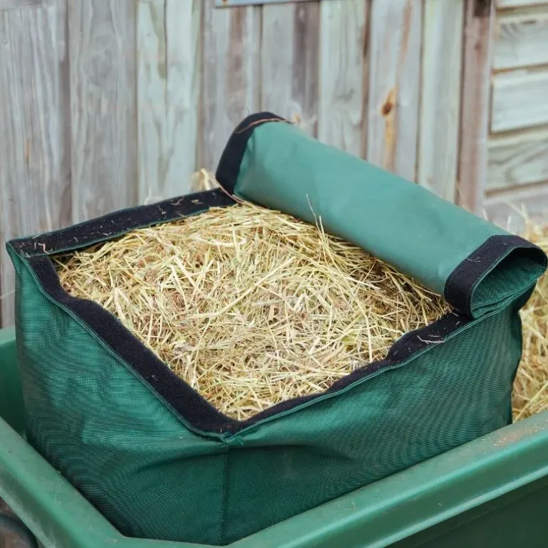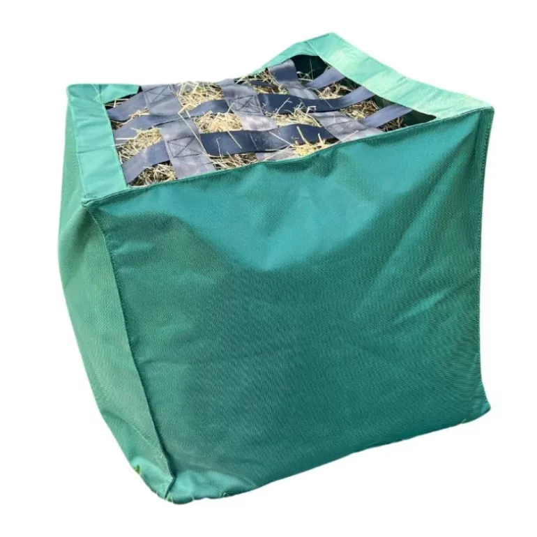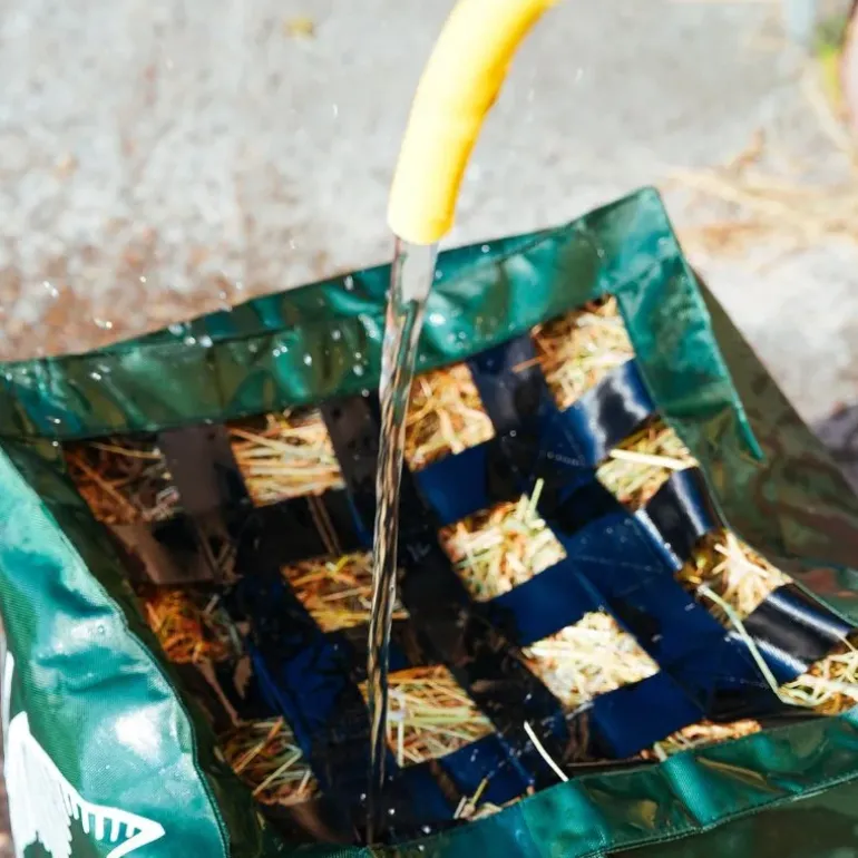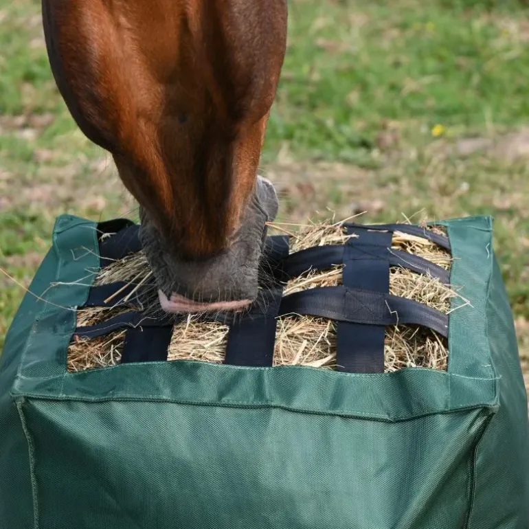 Le quadrillage en sangles souples permet une distribution progressive et contrôlée du foin. Cette configuration empêche l’ingestion trop rapide tout en maintenant l’intérêt du cheval pour son alimentation. Le face inférieure en velcro renforcée facilite grandement le remplissage et assure une fermeture hermétique.
