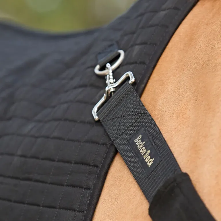 Fabriqué en coton, le chauffe-dos est complété de polyester Welltex® sur sa face intérieure. Les particules de céramique fondues dans les fibres du polyester permettent de renvoyer la chaleur du corps vers le cheval tout en stimulant la circulation sanguine. L’humidité est évacuée vers l’extérieur afin de garder le cheval au sec.