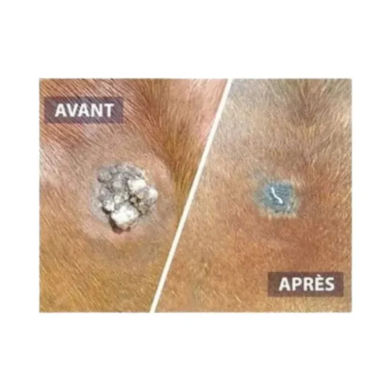 – Pour un sarcoide plat et étendu, appliquer le produit sur le pourtour du sarcoide, en évitant le tissu sain.