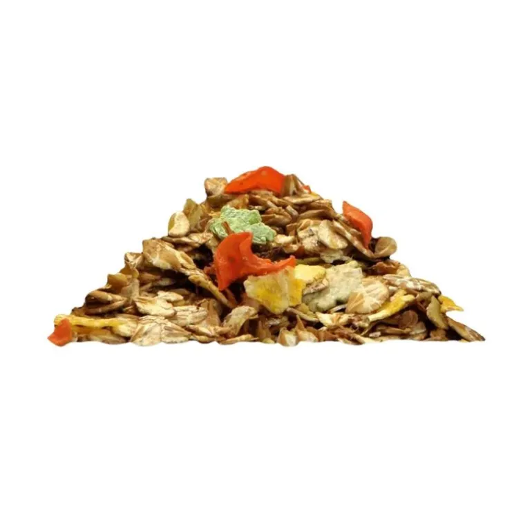 Flocons d’orge, Flocons de maïs, Marc de pomme, Mélasse de canne à sucre, Carottes séchées, Huile de colza, Flocons de pois, Huile de lin.